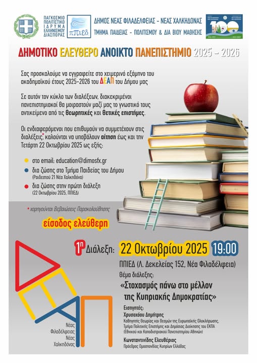 Το Δημοτικό Ελεύθερο Ανοικτό Πανεπιστήμιο του Δήμου Νέας Φιλαδέλφειας – Νέας Χαλκηδόνας ξεκινά τη νέα του #ακαδημαϊκή#χρονιά την Τετάρτη 22 Οκτωβρίου 2025, στις 19:00, στο φιλόξενο χώρο του #ΠΠΙΕΔ.
